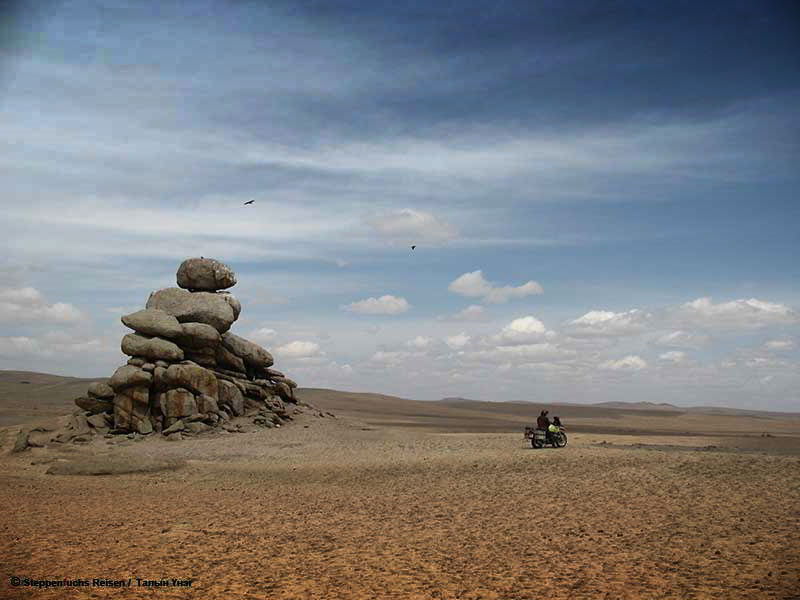 Heute führt die Route weiter nach Dalanzadgad, mitten durch die weite mongolische Grassteppe – die prägende Landschaft der Mongolei. Rund 80 Prozent der Landesfläche sind von dieser Steppe bedeckt, die mit ihren weiten Weidegründen eine wichtige natürliche Ressource des Landes darstellt. In dem trockenen Klima wachsen zwar kaum Wälder, aber das Grasland ist umso üppiger und bietet den Nomaden ideale Bedingungen für ihre Viehzucht.